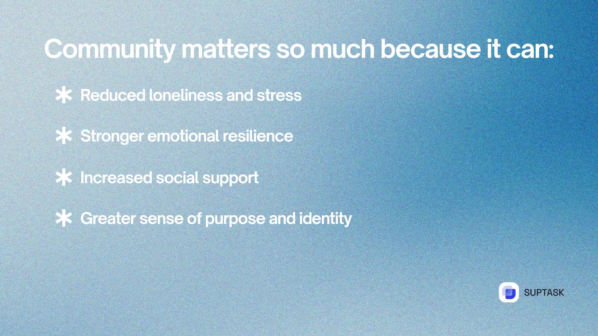 Being part of a community creates a sense of belonging and helps individuals know who they are (strengthening identity). It can also have positive effects on one's mental and physical health.