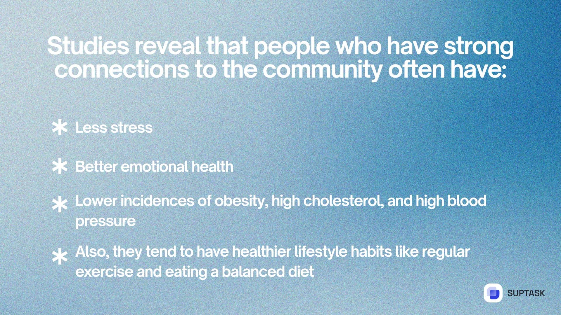 A community can significantly benefit mental and physical health in various ways, such as reducing stress, fighting loneliness, and promoting an even healthier lifestyle