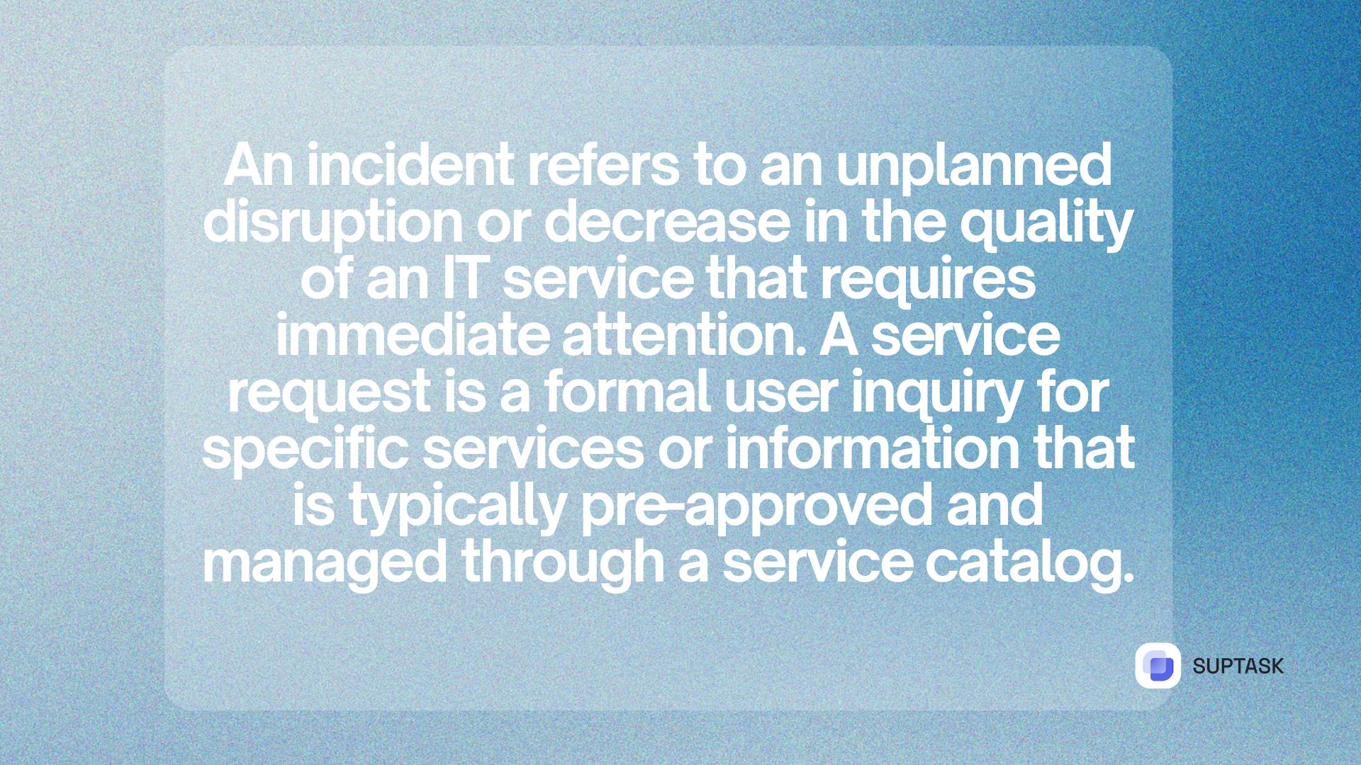 To better understand incidents and service requests, it's essential to recognize their distinct characteristics and how they are managed. Incidents refer to unexpected interruptions or degradation in the quality of an IT service. These require immediate attention to minimize disruption and restore normal operations. On the other hand, service requests are formal inquiries made by users for specific services or information. They are typically pre-approved or involve standard changes.