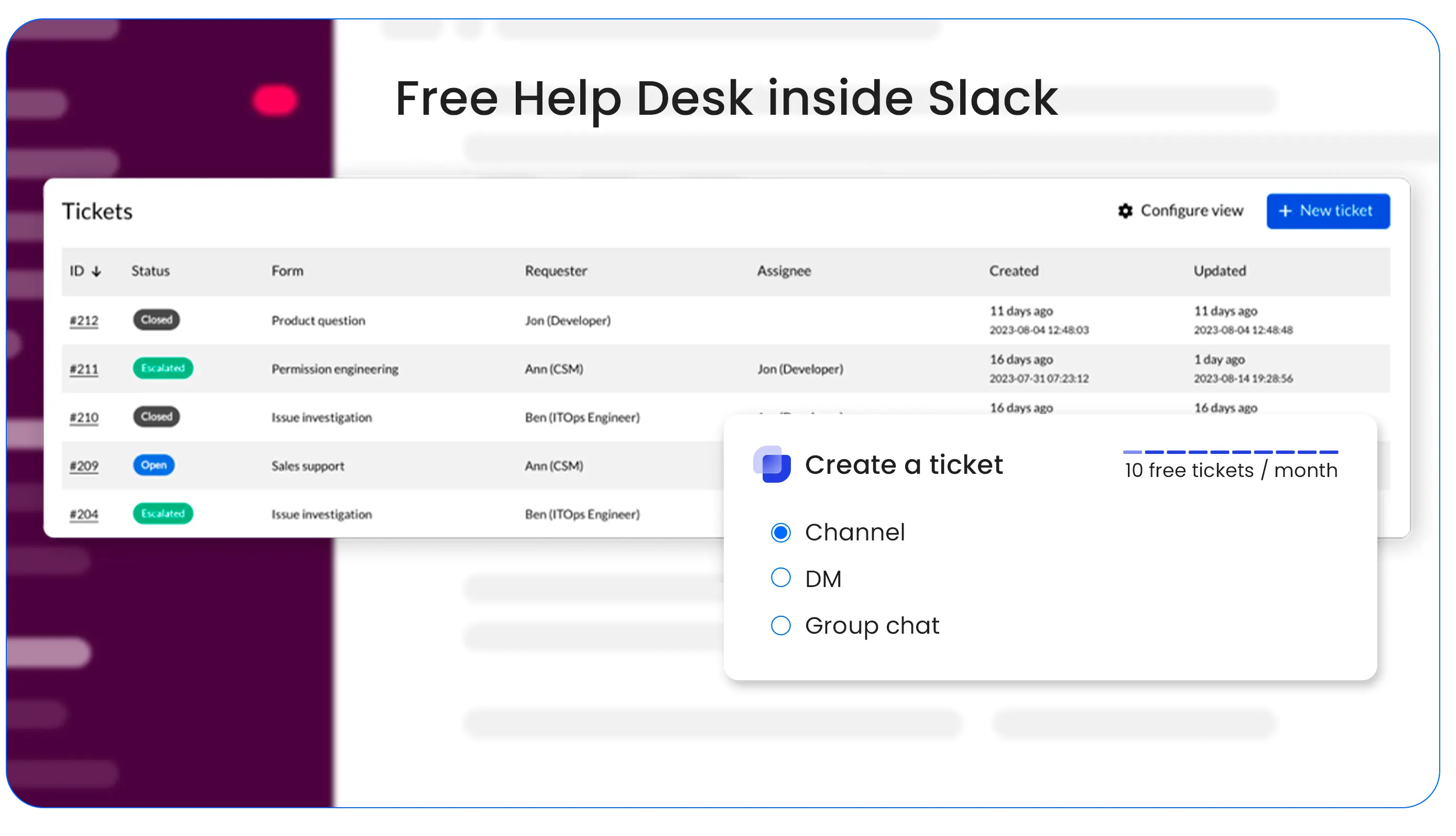 Suptask offer a free Slack ticketing system that lets you manage IT support, customer service, and help desk requests without leaving your workspace. This powerful software transforms Slack conversations into organized service requests, providing a centralized tool for efficient support management.