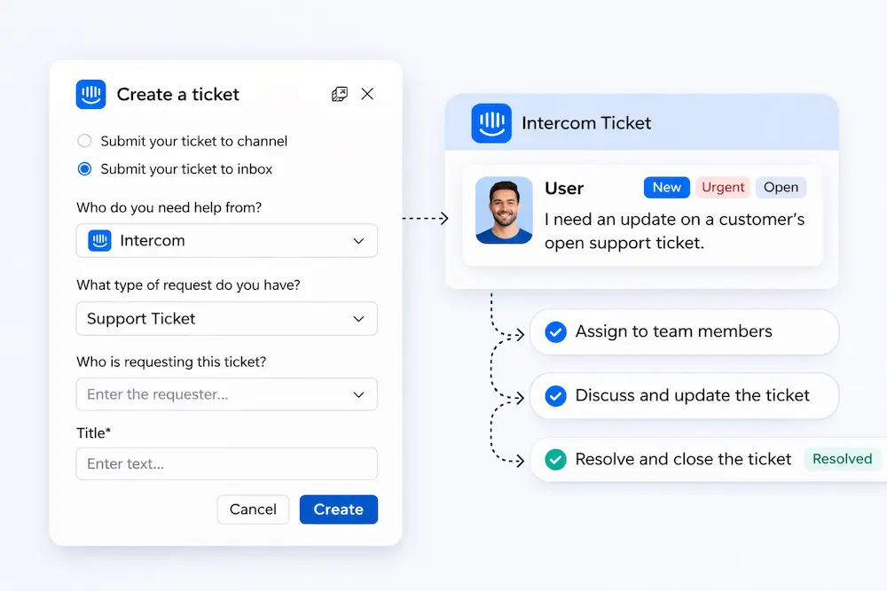 Suptask empowers you to optimize your workflows beyond simple ticket management. By integrating with Intercom, Suptask allows you to create and manage tickets directly within Intercom, facilitating seamless collaboration between your support teams on Intercom and other teams on Slack.